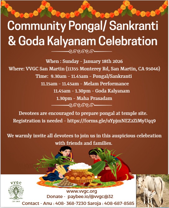 Community Pongal/Sankranti/Makara Vilakku /Makara Sankramana Celebration & Goda Kalyanam Celebration @ San Martin VVGC temple